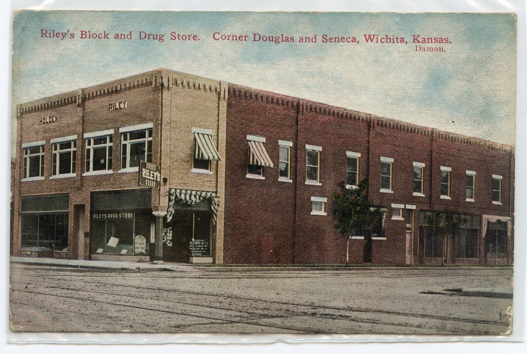 9143 Riley's Drug Store, 1896-1915; Post card, store exterior view; 5.3" x 3.5"; Courtesy Crispin's Drug Store Museum, Lincoln, KS