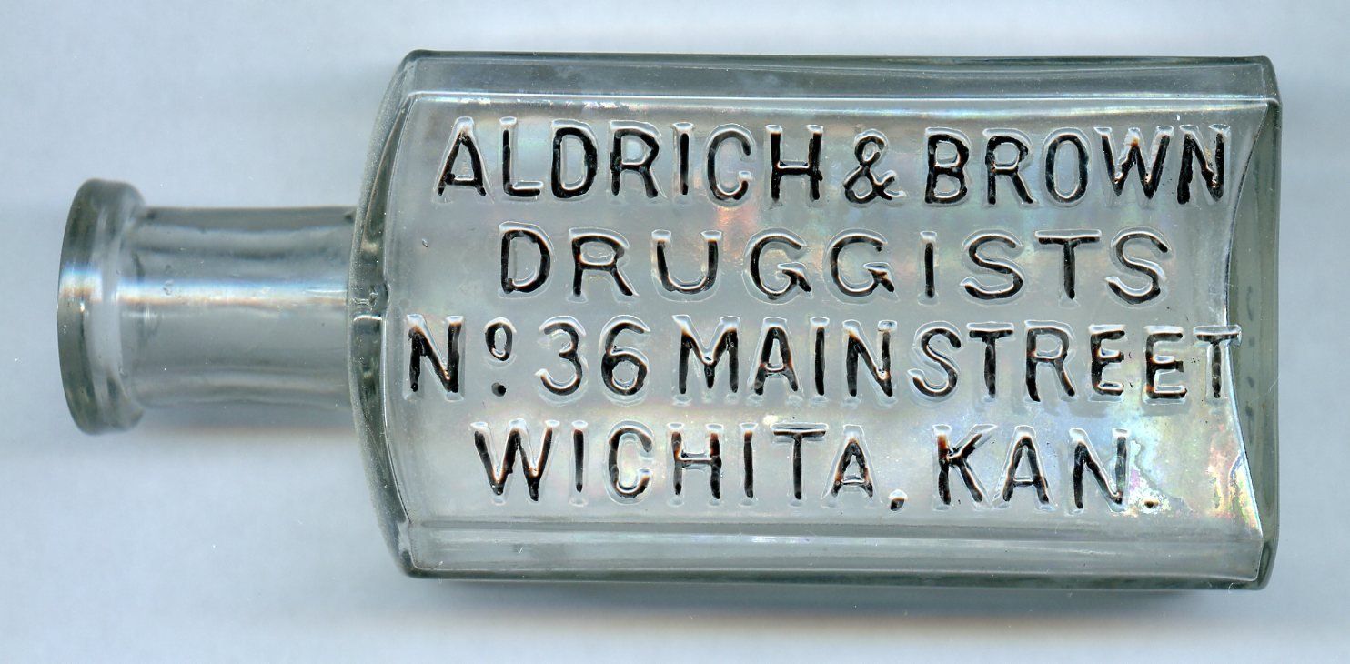 9170 Aldrich & Brown, Druggists; 1876-1891; Clear glass, blake style, tapered prescription lip, for cork stopper, back embossed; 1.8" x 1.2" x 4.5"; Courtesy Crispin's Drug Store Museum, Lincoln, KS