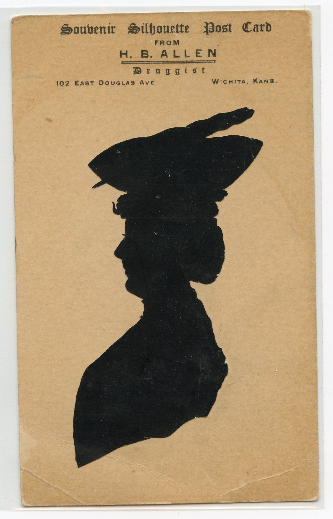 9385 Allen, H. B., Druggist, 1904-1915; "Souvenir Silhouette Post Card," black paper cut-out silhouette pasted to post card, "102 East Douglas Ave."; 3.3" x 5.5"; Courstesy Crispin's Drug Store Museum, Lincoln, KS