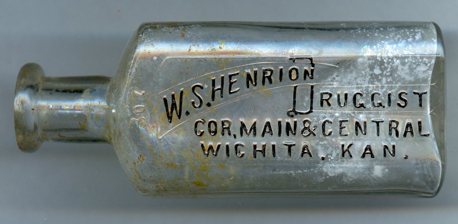 9411 Henrion, W. S., Druggist, 1902-1908; Clear glass, Knickerbocker Oval style, side seams to neck, for cork stopper, back embossed, 3 oz., 2.2" x 1.3" x 6.3"; Courtesy Crispin's Drug Store Museum, Lincoln, KS