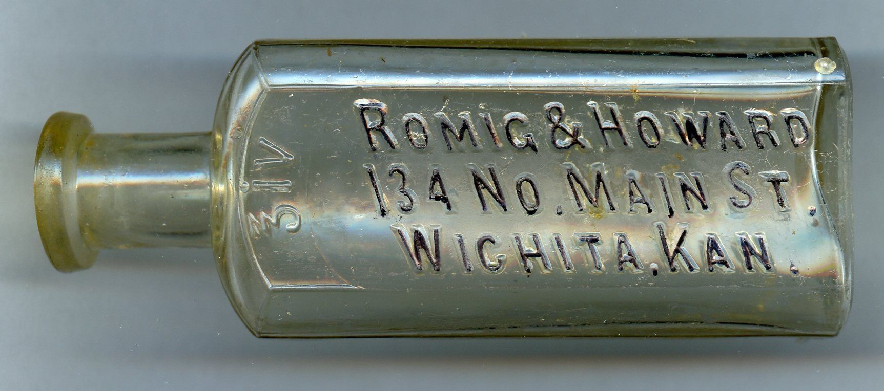 9850 Romig & Howard, Wichita, 1900; Clear glass, Knickerbocker Oval style, side seams to neck, for cork stopper, back embossed, 3 oz.; 2" x 1.2" x 5.3"; Courtesy Crispin's Drug Store Museum, Lincoln, KSe