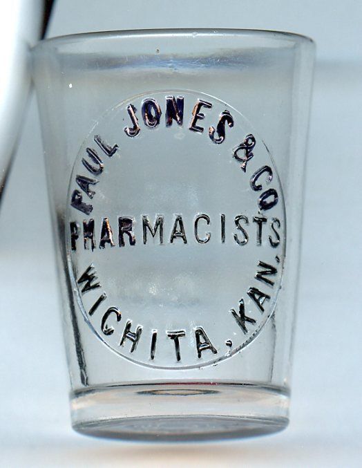 9990 Jones, Paul & Co., Pharmacists; 1883-1889; Clear glass; front embossed with name; back embossed with graduations and numbers; 1 tablespoon; 1.5" x 1.5" x 1.8"; Courtesy Crispin's Drug Store Museum, Lincoln, KS