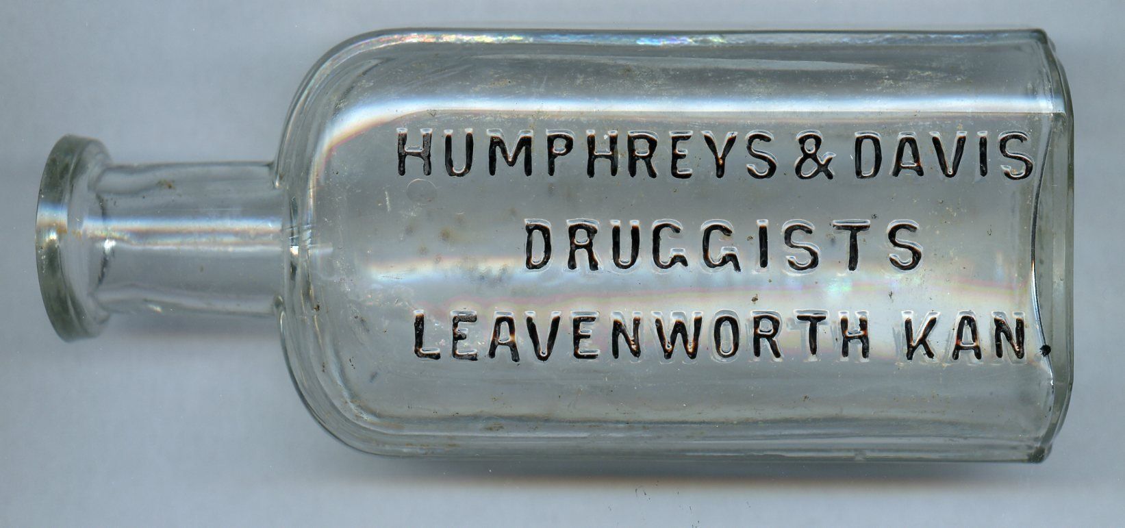 10150 Humphreys & Davis, Druggists, 1882-1889; Clear glass, odd shape, corner seams to neck, for cork stopper, bottom embossed: W. T. & CO. // PATD JAN 18 81; 2.1" x 1.5" x 5.1"; Courtesy Crispin's Drug Store Museum, Lincoln, KS