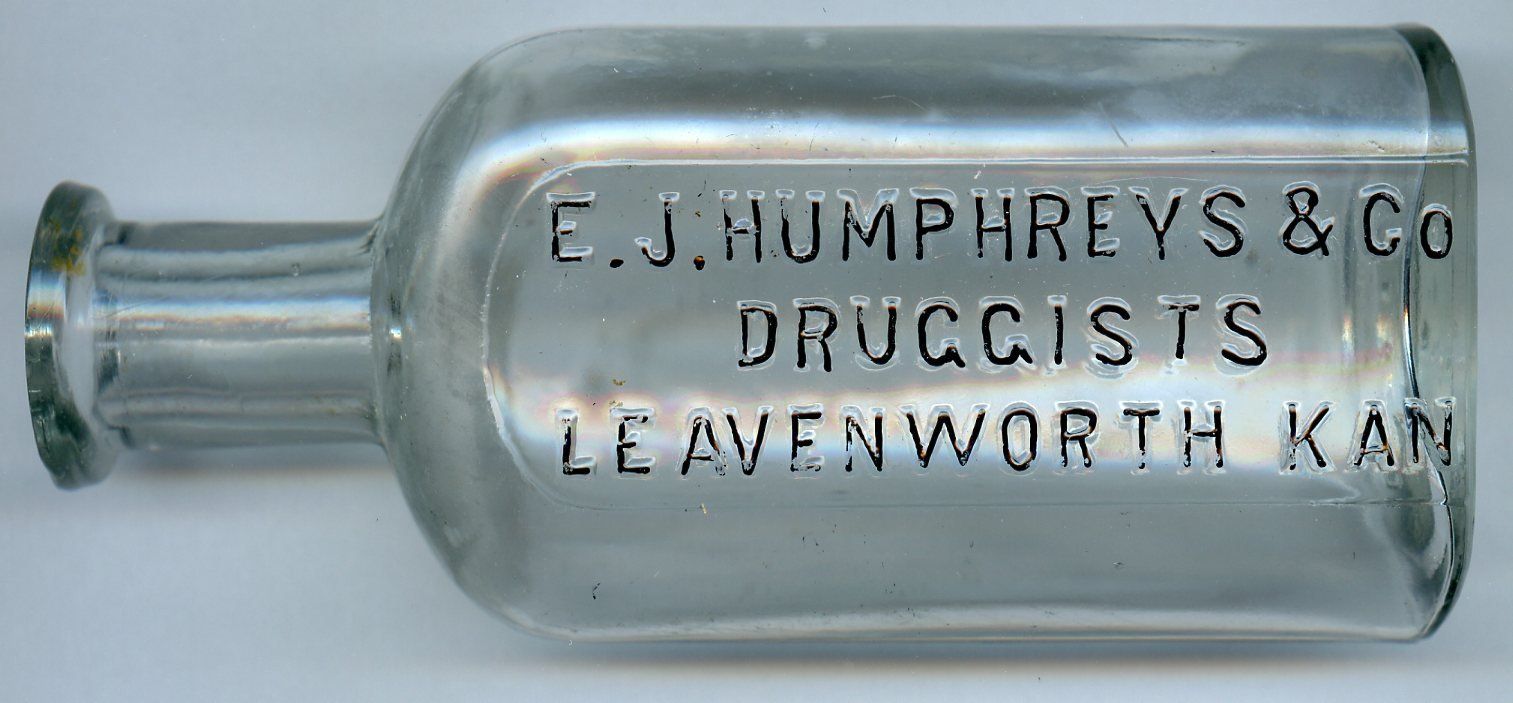 10477 Humphreys, E. J. & Co., Druggists; 1875-1881; Clear glass, Philadelphia Oval style, 3 oz. size, for cork stopper, embossed back; 2" x 1.2" x 4.8"; Courtesy Crispin's Drug Store Museum, Lincoln, KS
