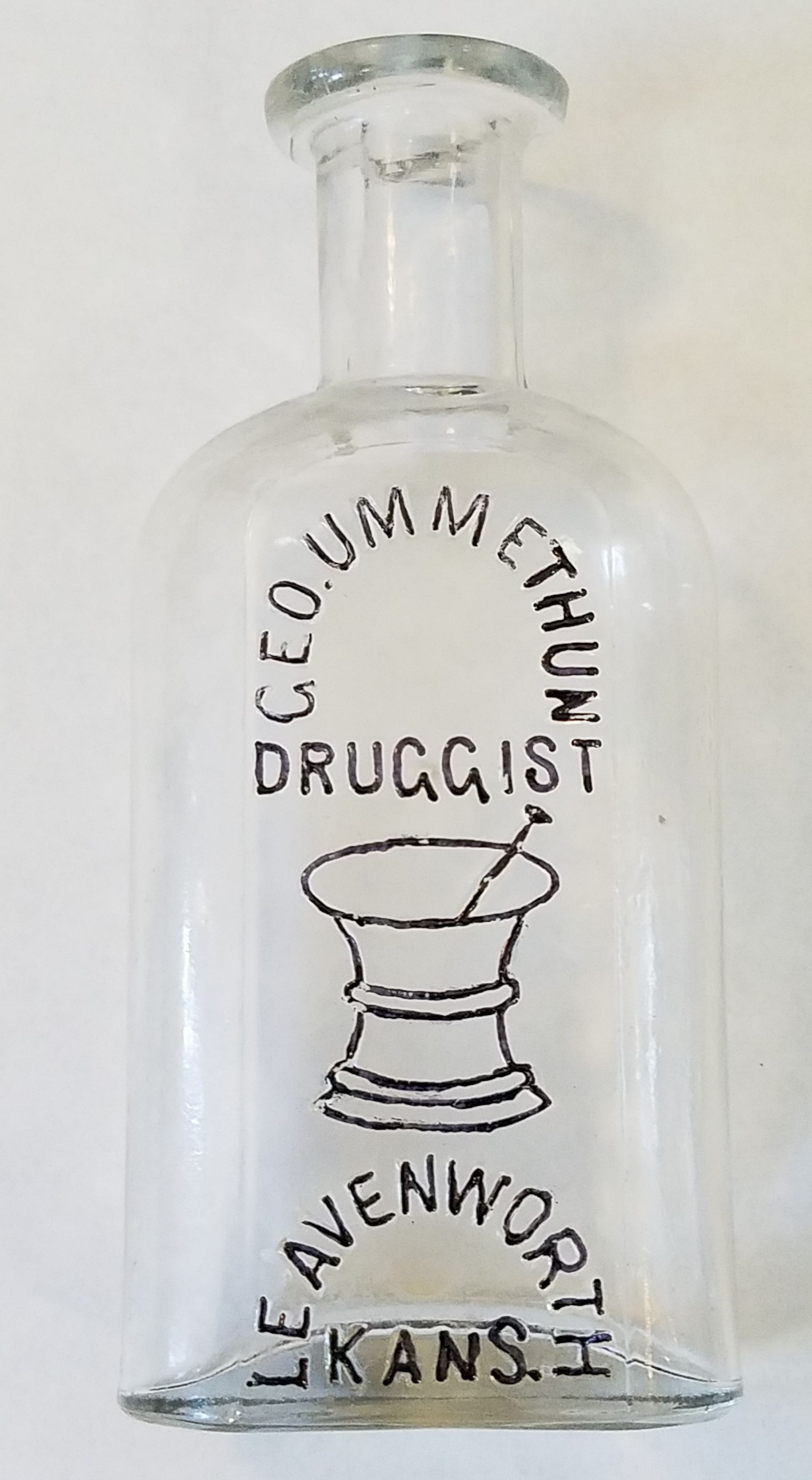 12761 Ummethun, Geo.: 1859-1891: clear glass Philadelphia Oval style; embossed back; 2 oz. size; 1.8" x 1" x 4.1"; Courtesy Crispin's Drug Store Museum, Lincoln, KS