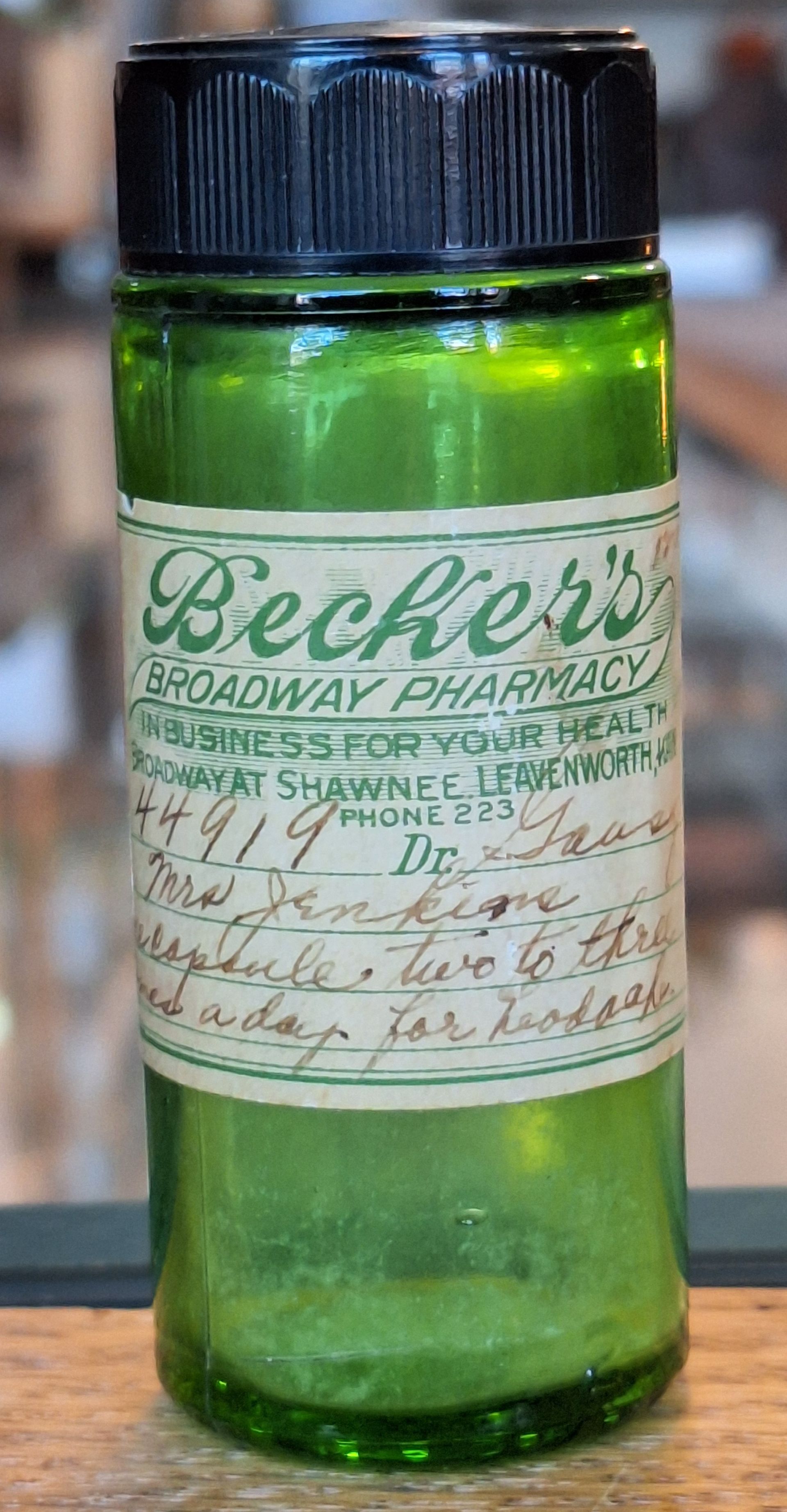 12852 Becker's Broadway Pharmacy: 1948; round green glass vial; hand written label; plastic screw cap; 1.2" x 1.2" x 3.1"; Courtesy Crispin's Drug Store Museum, Lincoln, KS