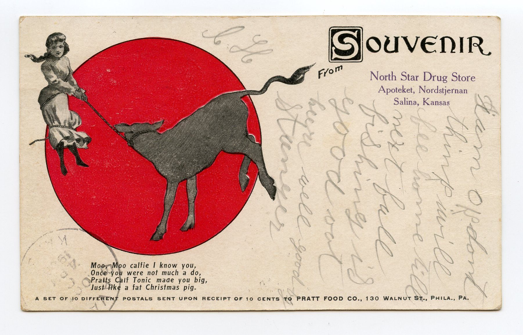 10050 North Star Drug Store, Nordstjernan Apoteket; 1906; Post card, advertising Pratt's Calf Tonic; 5.5" x 3.3"; Courtesy Crispin's Drug Store Museum, Lincoln, KS