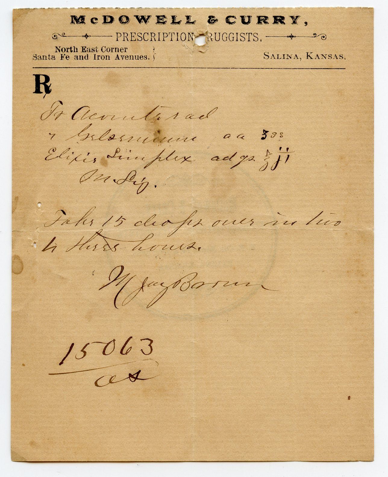 10496 McDowell & Curry, Prescription Druggists; c. 1890; Paper, hand written, "North East Corner Santa Fe and Iron Avenues"; 4" x 5"; Courtesy Crispin's Drug Store Museum, Lincoln, KS