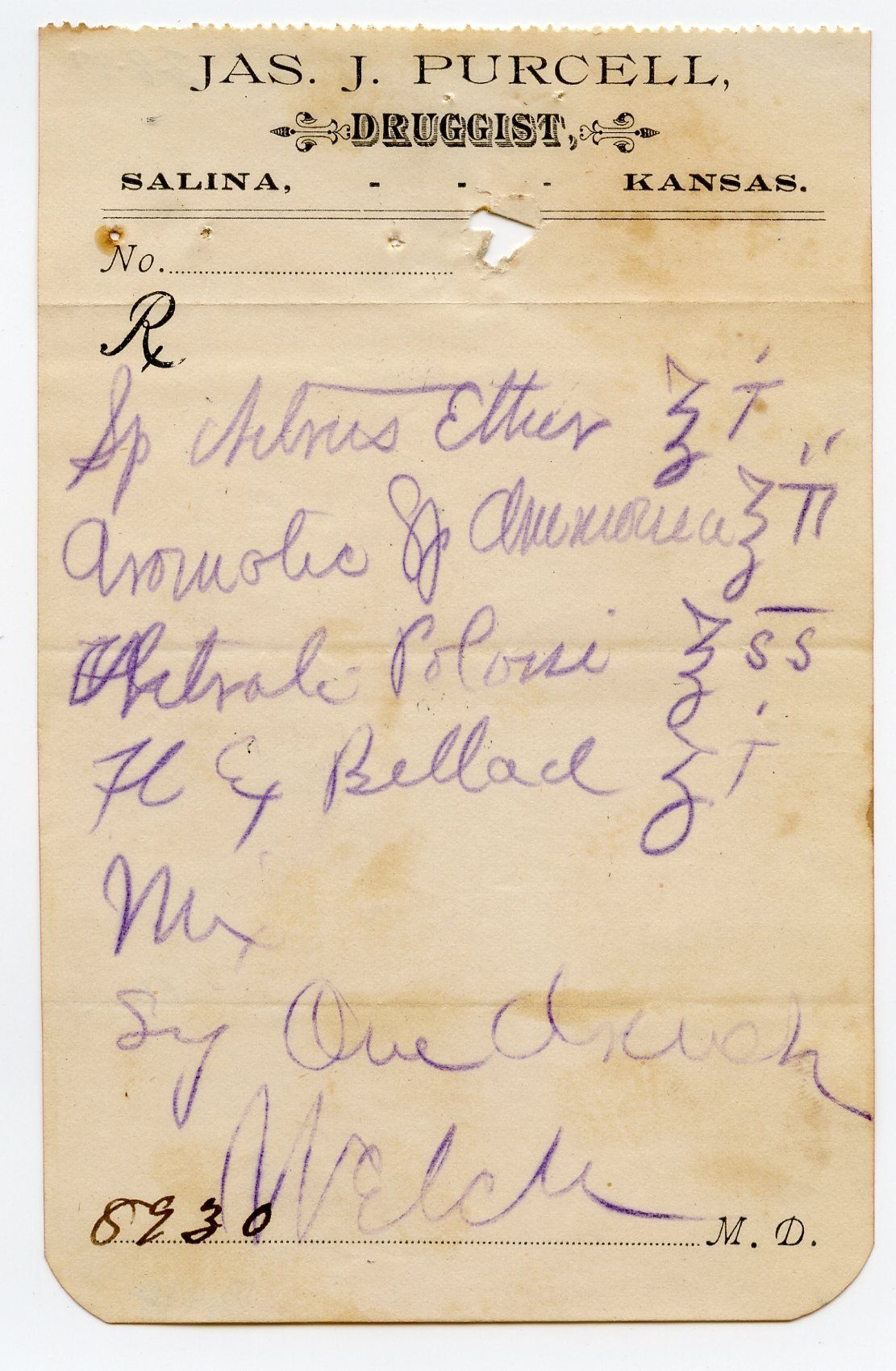 10498 Purcell, Jas. J., Druggist; c. 1890; Paper, hand written; 3.3" x 5.3"; Courtesy Crispin's Drug store Museum, Lincoln, KS