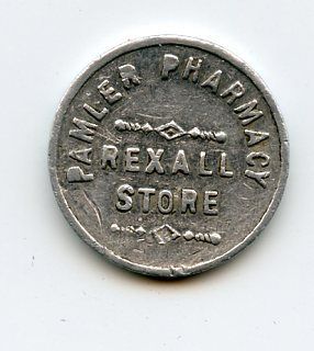 11340 Palmer Pharmacy; 1915; Aluminum round; front & back embossed; "GOOD FOR // ONE // 5¢ // IN CIGAR"; 0.7" x 0.7"; Courtesy Crispin's Drug Store Museum, Lincoln, KS