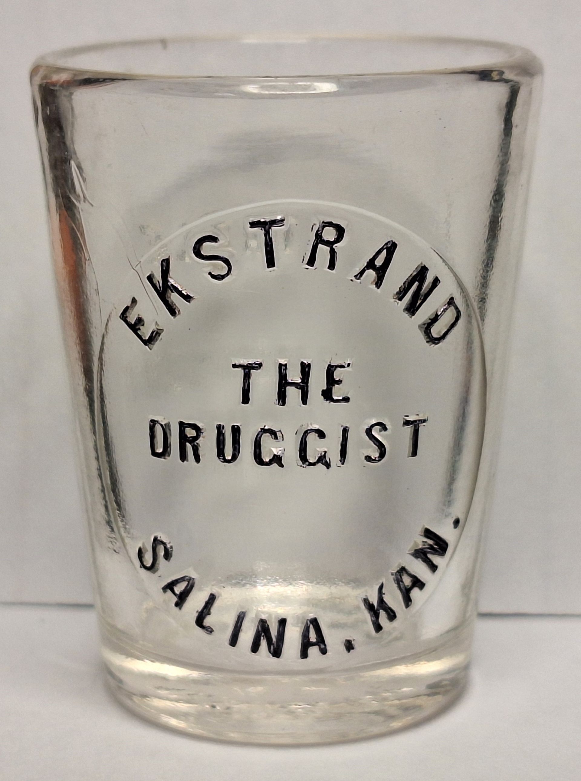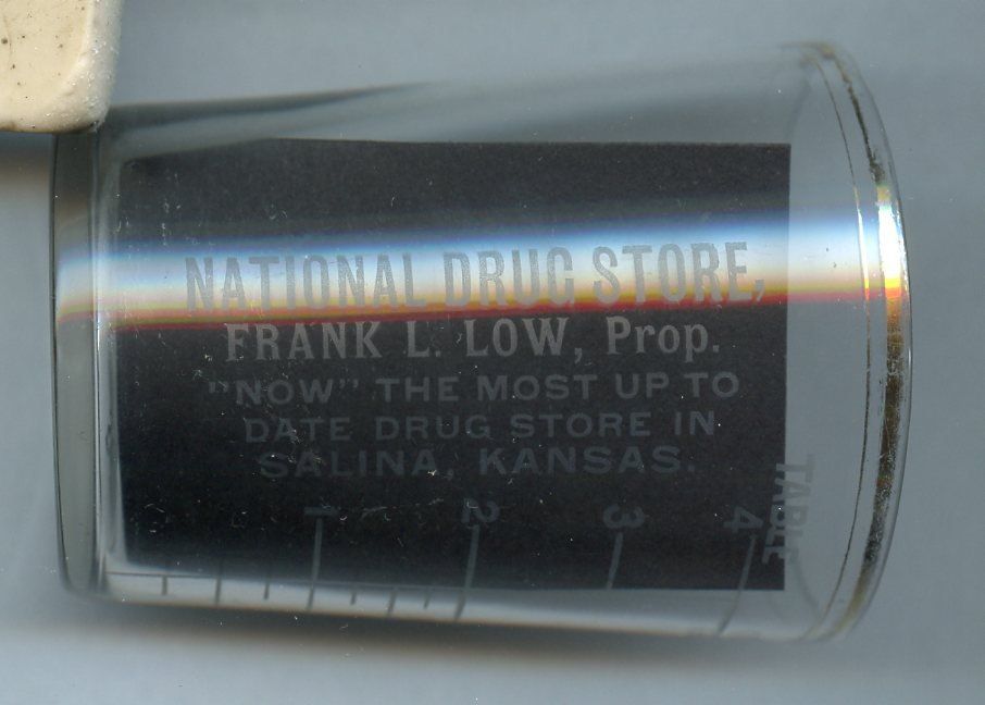 5564 National Drug Store, Frank L. Low, Proprietor; 1915; Clear glass w/ gilt rim, 4 tablespoon size, ' "NOW" THE MOST UP TO DATE DRUG STORE IN SALINA, KANSAS.'; 1.8" x 1.8" x 2.7"; Courtesy Crispin's Drug Store Museum, Lincoln, KS