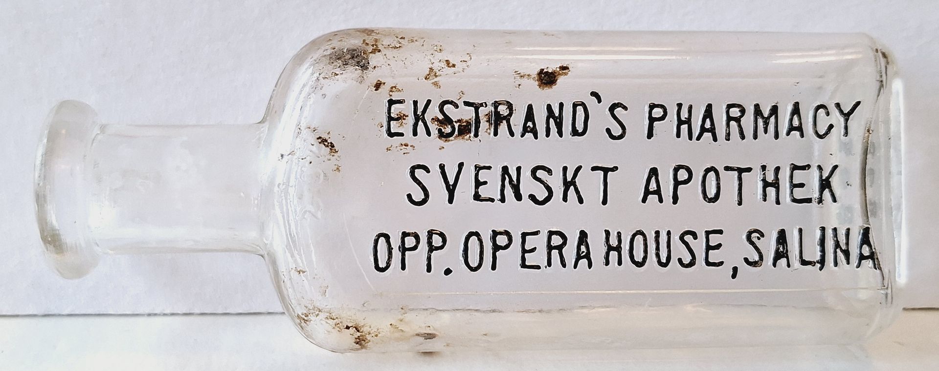 7368 Ekstrand's Pharmacy; 1898-1915; Drug store bottle; clear glass; Baltimore oval style; Rx lip; for cork stopper; back embossed: EKSTRAND'S PHARMACY // SVENSKT APOTEK // SALINA, KAN.; 1.7" x 1" x 4.5"; Courtesy Crispin's Drug Store Museum, Lincoln, KS