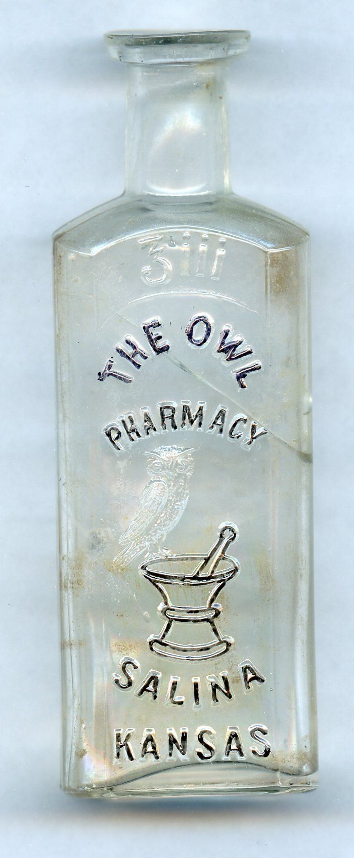 9106 Owl Pharmacy; Clear glass, Knickerbocker Oval; corner seam to neck; embossed back; for cork stopper; 1.7" x 1.2" x 5"; Courtesy Crispin's Drug store Museum, Lincoln, KS