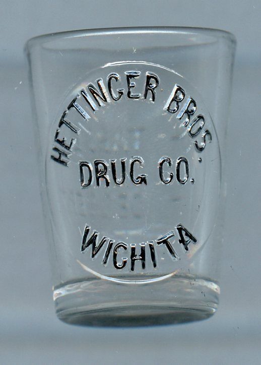 9883 Hettinger's Drug Store, 216 E. Douglas, 1890; Clear glass, blake style, tapered prescription lip, for cork stopper, back embossed; 2.6' X 1.6' x 6.1'; Courtesy Crispin's Drug Store Museum, Lincoln, KS