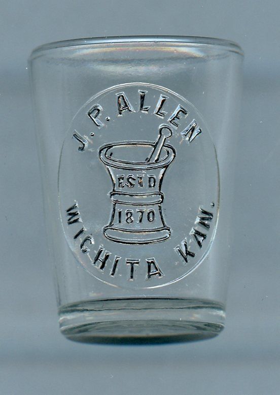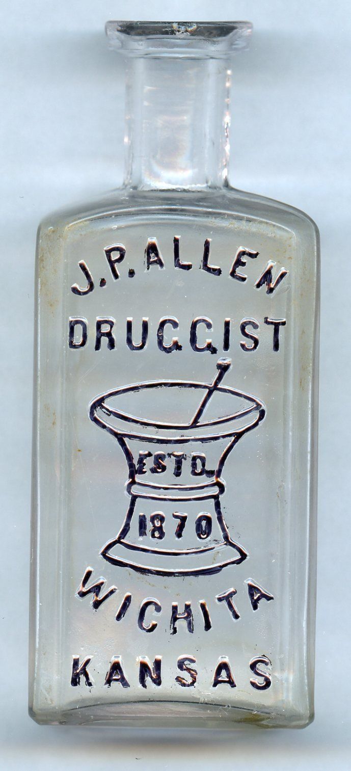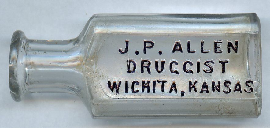 10304 Allen, J. P., Druggist; 1870-1900; Clear glass, Knickerbocker Oval style; back embossed; for cork stopper; 1.1" x 0.6" x 2.7"; Courtesy Crispin's Drug Store Museum, Lincoln, KS