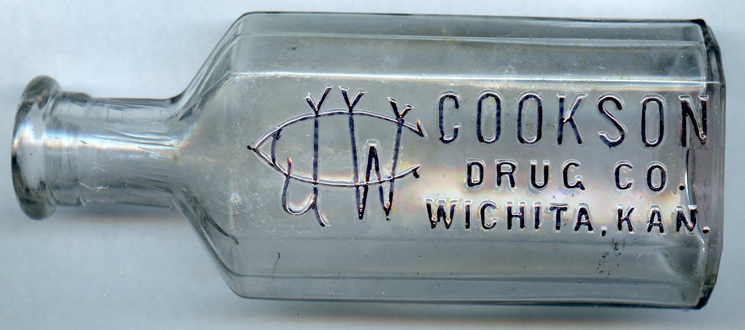 11151 Cookson Drug Co.; 1908-1915; Clear glass; 13 sided; embossed back; for cork stopper; 2" x 1.2" x 5"; Courtesy Crispin's Drug Store Museum, Lincoln, KS
