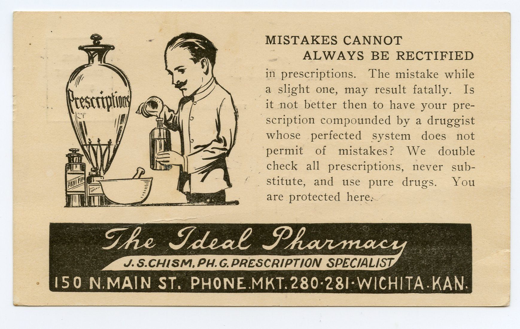 8649 Ideal Pharmacy; 1900-1915; Advertising postcard, postmarked 12/21/1915; 5.5" x 3.2"; Courtesy Crispin's Drug Store Museum, Lincoln, KS