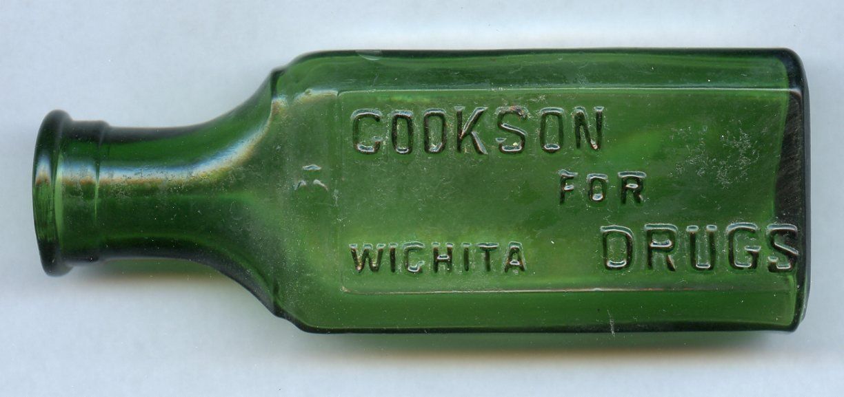 9180 Cookson, J. W., Drug Co.; 1908-1915; Green glass; rectangular; back embossed; for cork stopper; corner seams to neck; 1.3" x 0.8" x 3.7"; Courtesy Crispin's Drug Store Museum, Lincoln, KS