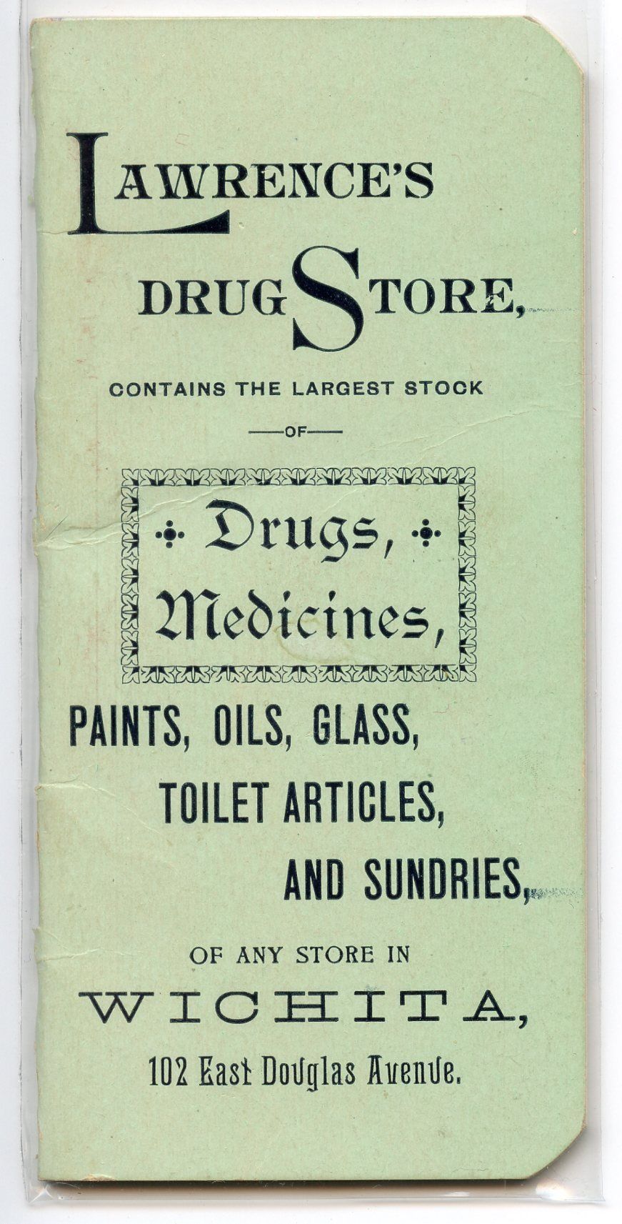 9571 Lawrence's Drug Store; 1897; Advertising memo book, blank graph paper pages inside; "Carries a Full Line of Homeopathic Remedies"; 2.5" x 5.3"; Courtesy Crispin's Drug Store Museum, Lincoln, KS