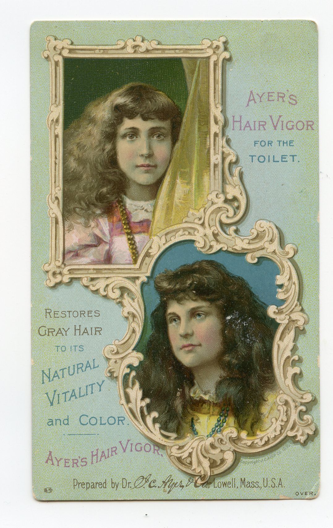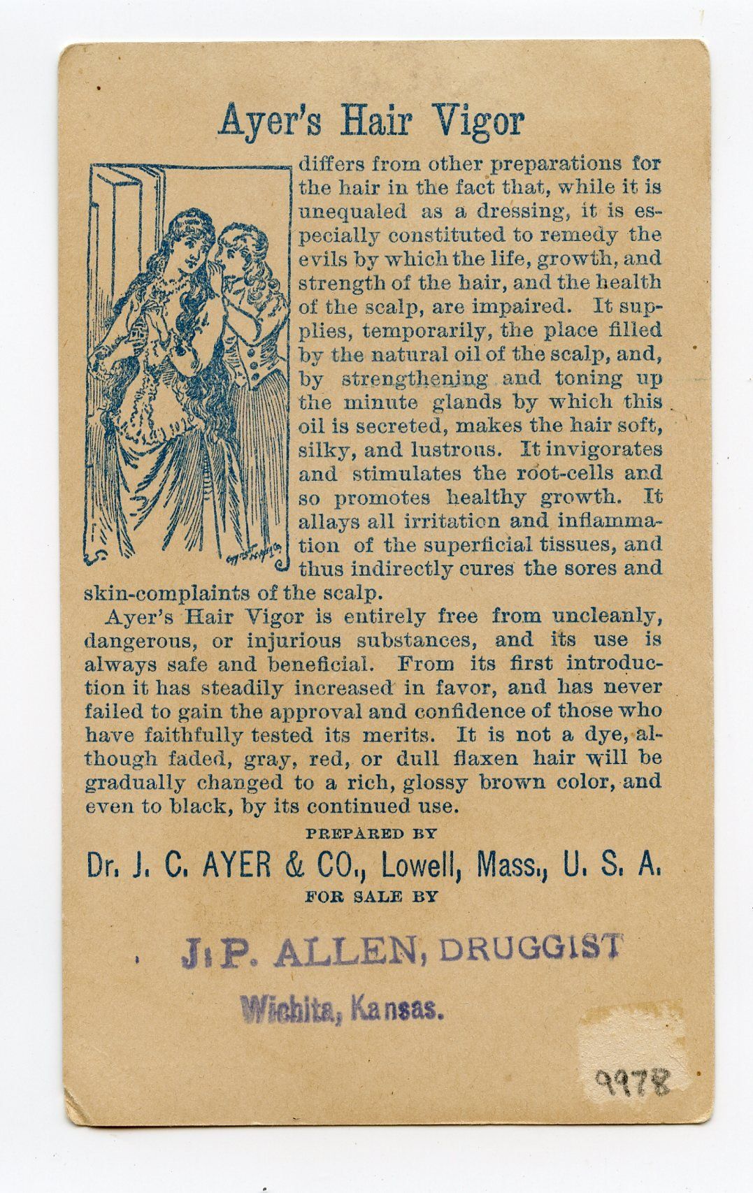 9978a Allen, J. P., Druggist; 1870-1906; Ayer's Hair Vigor; cardboard, drug store stamp on reverse; 3.1" x 5.1"; Courtesy Crispin's Drug Store Museum, Lincoln, KS